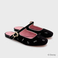 Mule flat de terciopelo negro con diseño moderno y desenfadado. Cuenta con un bordado único de notas musicales. Un guiño al espíritu artístico y musical.