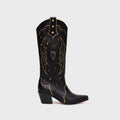 Bota en cuero negro con acabado de brillos sparkly. Presenta caña recta, punta cerrada y detalles brillantes en el frente. Interior y plantilla en cuero, suela de cuero y taco de 5 cm. Atemporal y glamorosa, perfecta para elevar cualquier outfit.