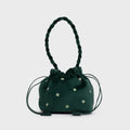Cartera tipo bucket en color verde. Su forma cilíndrica y amplia permite llevar todo lo esencial con comodidad. El frente lleva el símbolo del trébol y el cierre superior se ajusta con cordón. Un accesorio práctico y lleno de energía positiva.