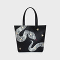 El bolso perfecto para darle el toque de glamour a tus outfits. Este tote bag de cuero color negro tiene una anaconda bordada por toda la cartera,