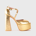 Te presentamos nuestra plataforma favorita, Biela. Es de cuero metalizado color dorado. Esta plataforma mide 5 cm y tiene un taco de 14 cm perfectos para bailar toda la noche. Podrás ajustar el zapato a tu gusto en la parte del tobillo.