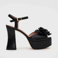 Te presentamos nuestra plataforma favorita, Fernanda. Es de cuero metalizado color negro. Esta plataforma mide 4 cm y tiene un taco de 11 cm perfectos para bailar toda la noche. En la parte del tobillo podrás ajustarlo a tu gusto. Encontrarás un aplique de una flor de cuero que estilizará todo tu outfit.