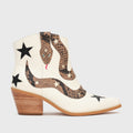 El botín es en cuero color hueso con una serpiente de cuero que envuelve la bota. El diseño lo acompañan unas estrellas en cuero color negro. El taco es de 5cm, perfecto para acompañarte en tus momentos especiales.