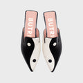Lucky Yin Yang en cuero negro con diseño destalonado y punta cerrada. El frente está decorado con el símbolo Yin Yang bordado en contraste blanco. Plantilla y forro en cuero, suela de cuero resistente y taco bajo de 2 cm. Un calzado cómodo y moderno que equilibra estilo y personalidad.