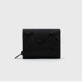 Descubre nuestra billetera Louise en cuero color negro con unos lazos en la parte de adelante. Dentro de la billetera podrás encontrar un espacio para poner tus billetes, tres espacios para tarjetas y un monedero con cierre.