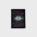 ENAMÓRATE DE NUESTRO PORTAPASAPORTE SHAZAM, PORTAPASAPORTE DE CUERO NEGRO CON DETALLE DE OJO.