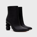 Botín en cuero negro con una silueta moderna y elegante. Este diseño destaca por su taco escultórico de 9 cm, compuesto por formas redondeadas que crean un efecto visual único y sofisticado. La combinación de diferentes texturas de cuero aporta profundidad y carácter al modelo. Un botín llamativo y contemporáneo que se convierte en el protagonista de cualquier look.