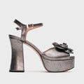 Te presentamos nuestra plataforma favorita, Fernanda. Es de cuero metalizado color negro. Esta plataforma mide 4 cm y tiene un taco de 11 cm perfectos para bailar toda la noche. En la parte del tobillo podrás ajustarlo a tu gusto. Encontrarás un aplique de una flor de cuero que estilizará todo tu outfit.