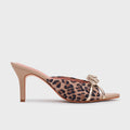 Zapato pump en cuero con estampado de leopardo y punta abierta. En el frente resalta un delicado lazo ancho en cuero dorado, trabajado a mano con volumen y carácter. Forro y plantilla en cuero para suavidad, suela de cuero resistente y taco forrado de 7 cm. Atrevido y sofisticado, ideal para dar fuerza y personalidad a tu look.