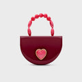 Cartera de tamaño compacto en cuero color mora, con silueta media luna y diseño estructurado. En el frente luce un corazón aplicado en tono rosado con marco dorado, que suma un detalle dulce y distintivo. Tiene asa corta de cuentas en tono rosado traslúcido, ideal para llevar en la mano. Un diseño llamativo y femenino que combina carácter y romanticismo en una sola pieza.